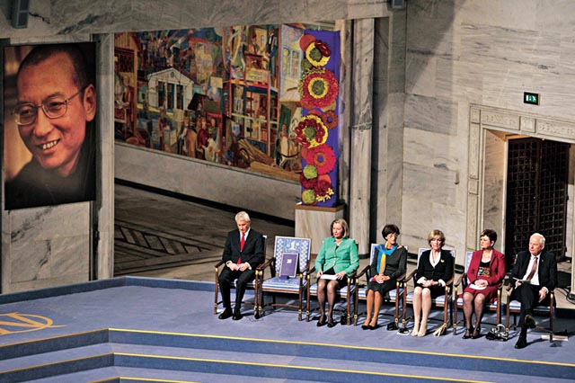 我們深感遺憾的是,和平獎獲得者劉曉波正被隔離監禁在中國東北部的一個監獄裏,不能親自出席今天的儀式。他的妻子劉霞或其他親屬也不能前來。因此,今天我們不會頒發和平獎的獎章和證書。
